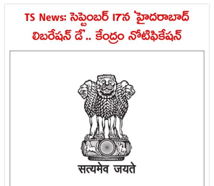 దిల్లీ: కేంద్ర ప్రభుత్వం సెప్టెంబర్ 17కు సంబంధించి కీలక నిర్ణయం తీసుకుంది. ఏటా సెప్టెంబర్ 17న ‘హైదరాబాద్ లిబరేషన్ డే’ నిర్వహించాలని కేంద్ర హోంమంత్రిత్వ శాఖ గెజిట్ నోటిఫికేషన్ జారీ చేసింది. ఆ రోజు అధికారిక కార్యక్రమాలు నిర్వహించాలని గెజిట్లో పేర్కొంది.