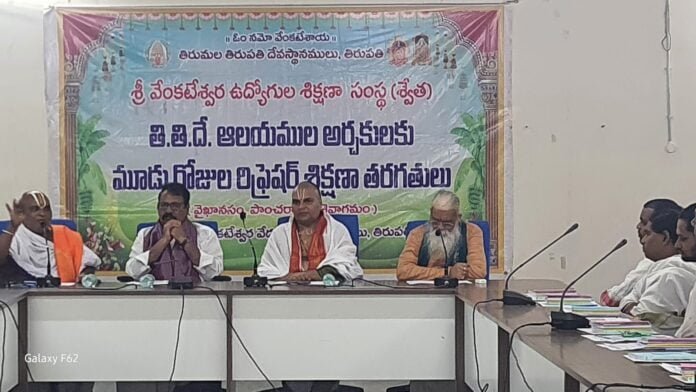 టీటీడీ ఆలయాల్లో పనిచేస్తున్న అర్చకులకు శ్రీ వేంకటేశ్వర ఉద్యోగుల శిక్షణ సంస్థ(శ్వేత) ఆధ్వర్యంలో మూడు రోజుల పునశ్చరణ తరగతులు మంగళవారం తిరుపతిలోని ఎస్వీ వేద విశ్వవిద్యాలయంలో ప్రారంభమయ్యాయి.